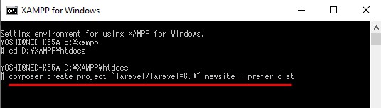 無事、Shellがhtdocsに移動したら、いよいよLaravel6をhtdocsフォルダにインストールします。