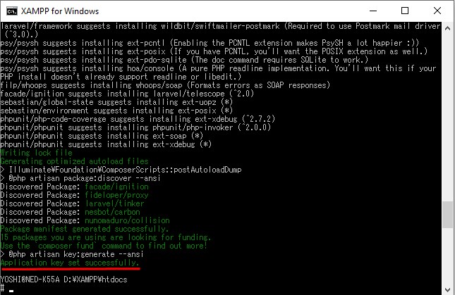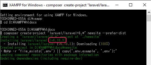 インストールが始まりました。見ると当方の場合、laravel バージョン6.18.3がインストールされてますね。(細かい番数はその時々により違いますが問題ないです)