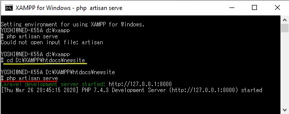 php artisan servecdで今作ったnewsiteフォルダに移動します。