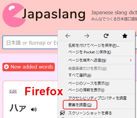 ウェブサイト上で右クリックすると、Firefoxだったら「要素を調査」、Chromeだったら「検証」って項目が出てきます。