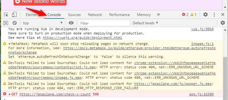 このコンソールには、ウェブサイト上のそれぞれの機能が正常に作動してるかが表示されます。で、Javascriptが壊れてるとか、エラーも表示されます。
