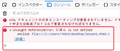 「にほん」ボタンを押して、コンソールを見ると、Uncaught ReferenceError っていうエラーが出てます。しかも「にほん」という文字が表示されません。