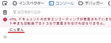 図のように、ブラウザのコンソールに「にっぽん」という文字が出ます。これは、HTML側に書いた