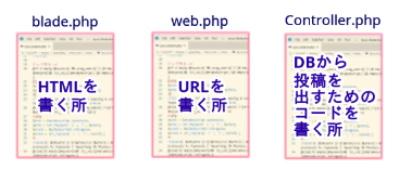 Laravelでは、ページを表示するために、基本的に3つのPHPファイルに役割を分けて書きます。