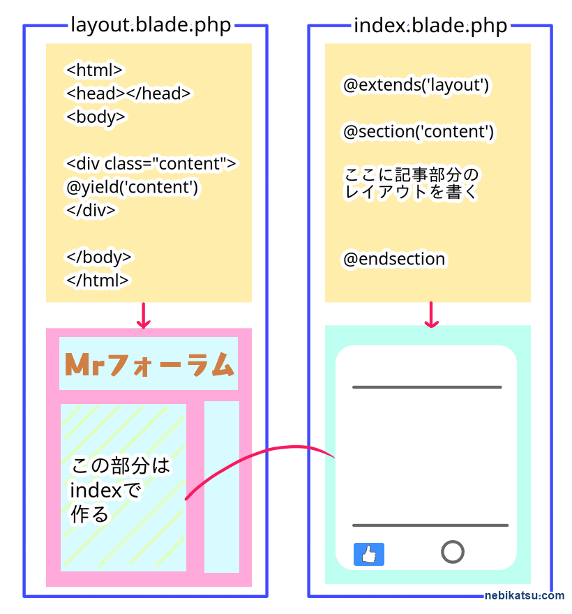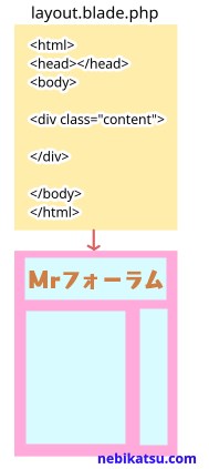 なので、Laravelでは通常、共通する全体のレイアウトだけのブレード(layout.blade.php)を作成し、中身がページごとに変わる部分だけ、ページごとのブレードを作ります。