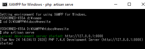 次に、php artisan serve と入力し、Enterします。