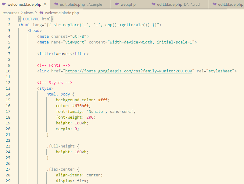 では、resources\viewsフォルダのwelcome.blade.phpをテキストエディタで開いて、中身のコードを見てみましょう。(エディタはVScodeがおすすめ!)