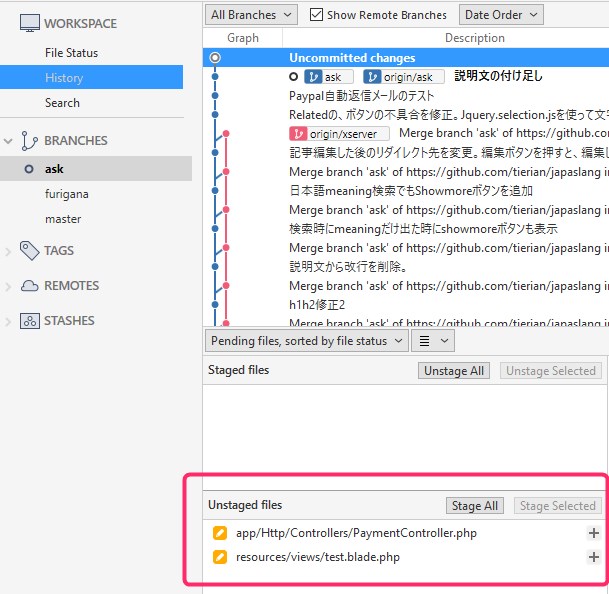 Unstaged files というのは、まだstage(add)してないファイル達一覧です。