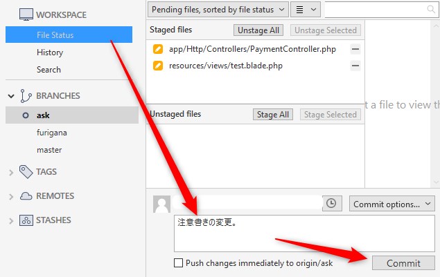 次にFile statusタブに移動すると、コミット前のメッセージを入れる欄が出てきます。