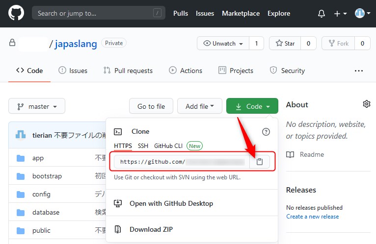 自分のGithubにログインし、リポジトリを開き、Codeというボタンを押したところで、取得できます。このアドレスを使って、git clone コマンドを打ちます。