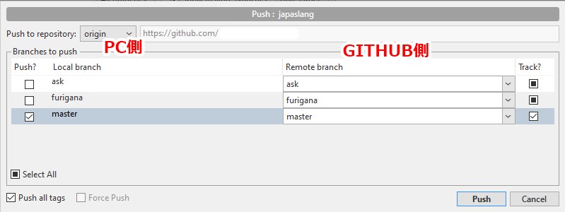 次の画面でも、masterからmasterの欄にチェックを入れて(最初から入ってる)Pushを押せば完了です。