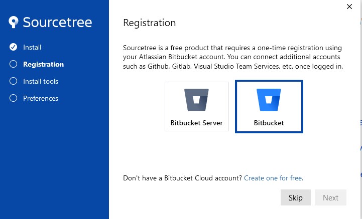 Bitbucketをクリックする事で、Bitbucketアカウントを作ります。注意書きに書かれている通り、SourceTreeはBitbucketアカウントを作らないと使えません。なので、Skipせず、アカウントをここで作ります。