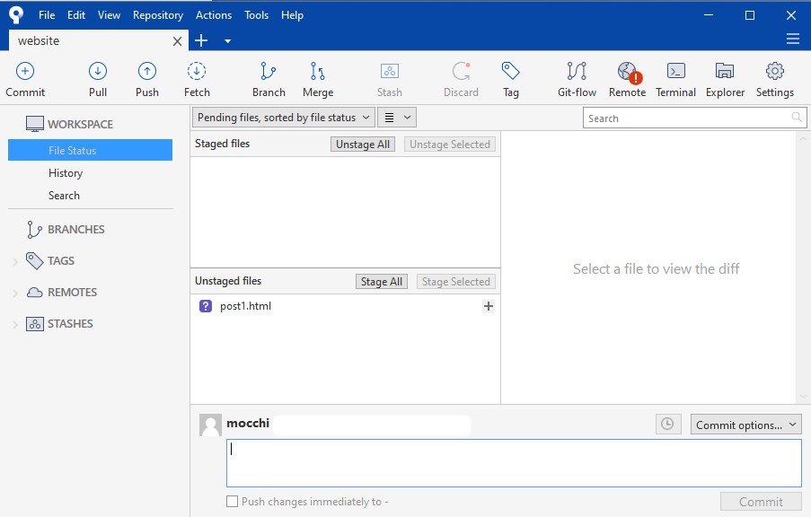 フォルダに何かファイルが入ってれば、Unstaged filesというところに表示されます。