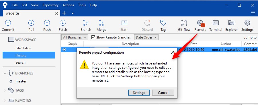 Remoteというボタンを押すと、まだ設定してないよという警告が出るので、Settingsを押します。