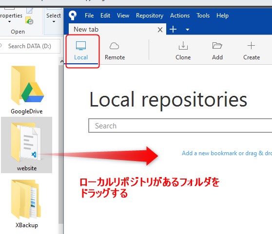 今設定したローカルリポジトリファイルをドラッグします。