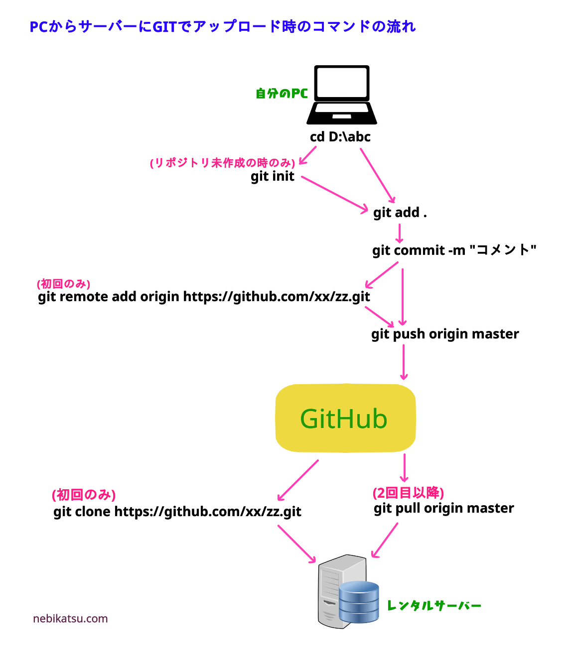 PCからサーバーにファイルをアップロードする時のGITコマンドの流れです。
