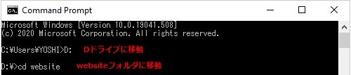 cd パス と入力しEnter。画像のパスなら cd D:\website です。
