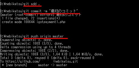 git add .と入力しEnter(リポジトリ内の全ファイルがStageされます)。- git commit -m “コメント” と入力しEnter