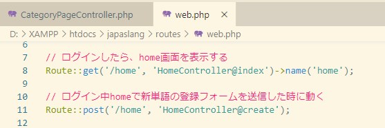 例えば、web.php(routes)上では、Route::get(‘/home’, ‘HomeController@index’);のような書き方をしますが、これも、namespace上でパスをすでに指定してあるため、