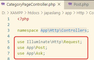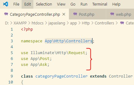 [st-kaiwa1 r]このCategoryController.php上で使いたいファイルのパスをuseの所に書くというわけ。書く時は、Appのように単語の最初を大文字にして書く必要があるよ。[/st-kaiwa1]