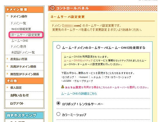 そして、いよいよドメインを移行先サイトに移します(ネームサーバの紐づけ)。