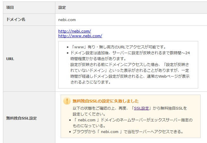 無料独自SSLに関しては、チェックをこの時点で入れてもONにはならないのでどちらでもいいです。(下の画像のようにSSL設定に失敗しましたと出るだけです。これは気にしなくてOK。)