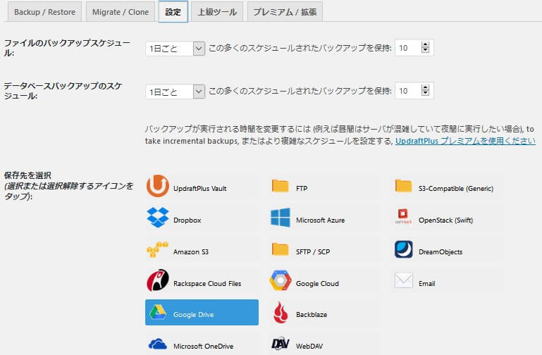 UpdraftPlusを有効化したら、「設定→UpdraftPlus Backups」と行き、