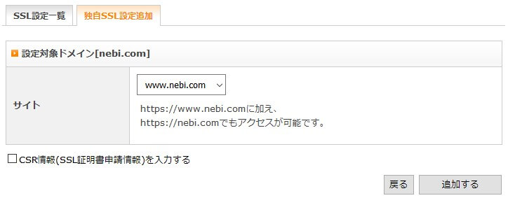 「独自SSL設定追加」タブを選び、「www」のドメインを選んで「追加する」を押します。