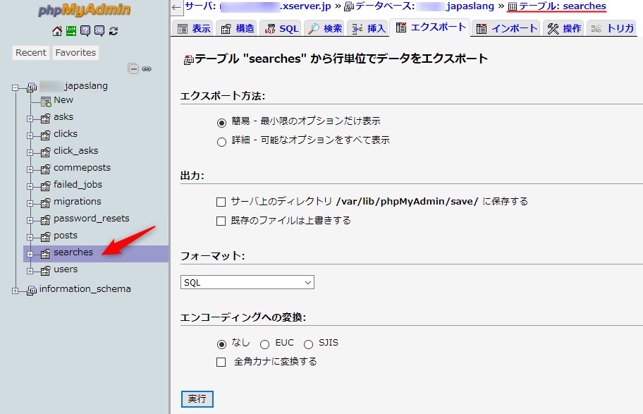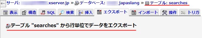 例えば、下の画像のように、パンくずリストで現在位置がテーブル: searchesになってる状態で、エクスポートタブを開くと、
