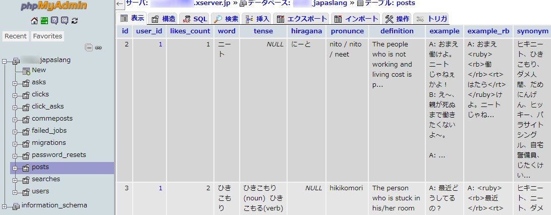 例えば、辞書サイトjapaslangというデータベースのpostsテーブルを開いてみると、下の画像のようにExcelのようなシートが表示されます。