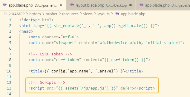 この <script src=”{{ asset(‘/js/app.js’) }}” defer></script> みたいな一文が入ってると思います。