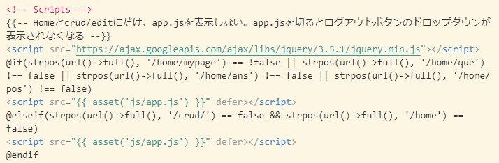 下の画像のような感じにif文を使って、特定のページだけ <script src=”{{ asset(‘js/app.js’) }}” defer></script>を表示しないようにすればいけますよね。