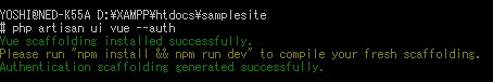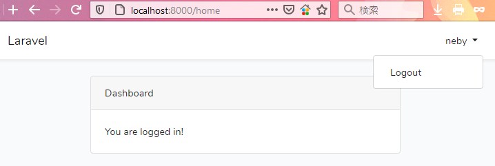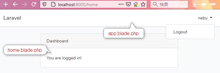 実はこの時点で、Laravelサイト上では、もうログイン機能が使えるようになってます。
