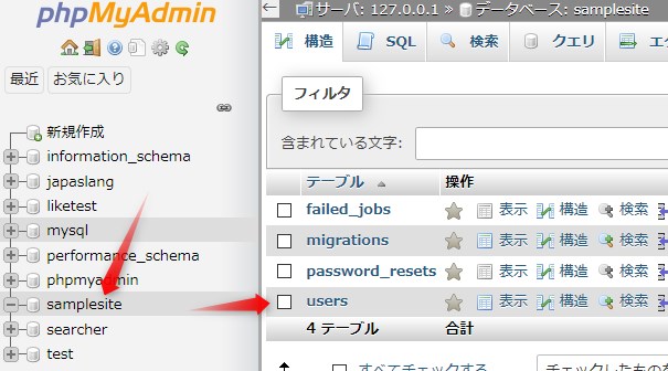 マイグレーションが完了すると、usersテーブルが出来てるはずです。