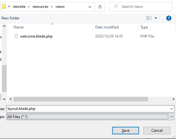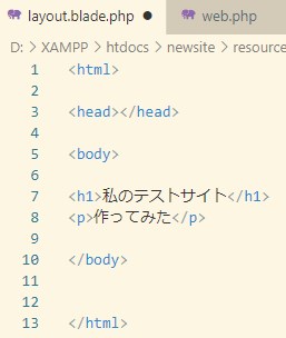 で、空のテキストファイルを、resources\viewsフォルダに、layout.blade.phpという名前で保存します。