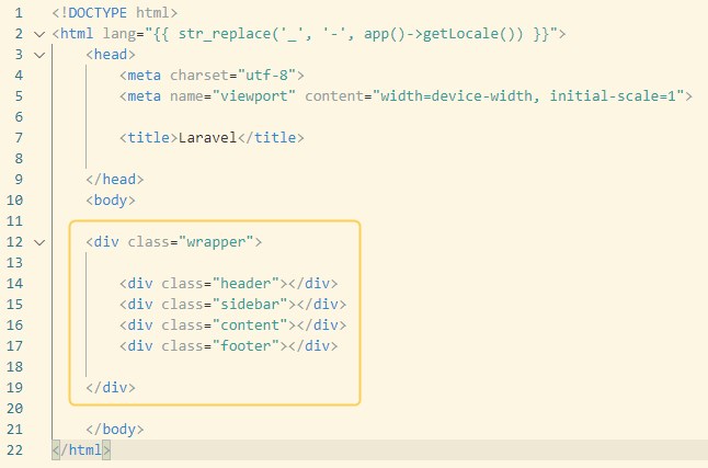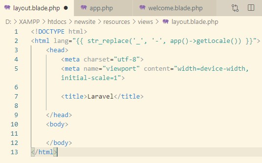次にlayout.blade.phpにサイト全体のレイアウトをHTMLで書いていきます。