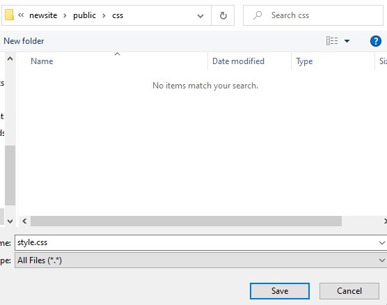 次に、またテキストエディタで空の新規ファイルを作成し、このフォルダの中に、style.cssという名前で保存します。