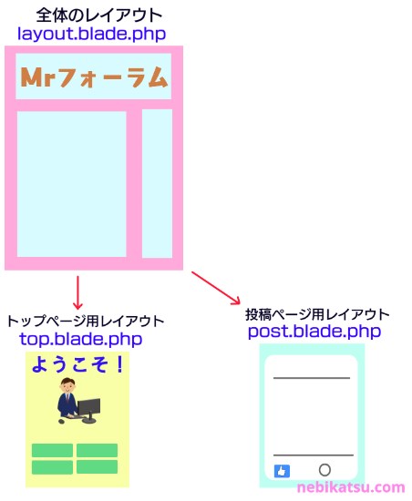 [st-kaiwa1 r]ここから、継承(extends)っていうPHPの機能を使って、ブレードを分けていくんだ。[/st-kaiwa1]