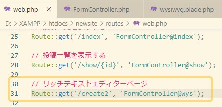 ちなみに、Quillエディタで入力した情報を、FormControllerに渡すルート設定は、以前のチュートリアルのform送信用ルートをそのまま使ってます。