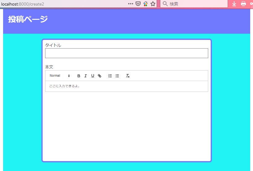 これで、/create2というURLにブラウザからアクセスすると、wysiwyg.blade.phpが表示されるようになりました。