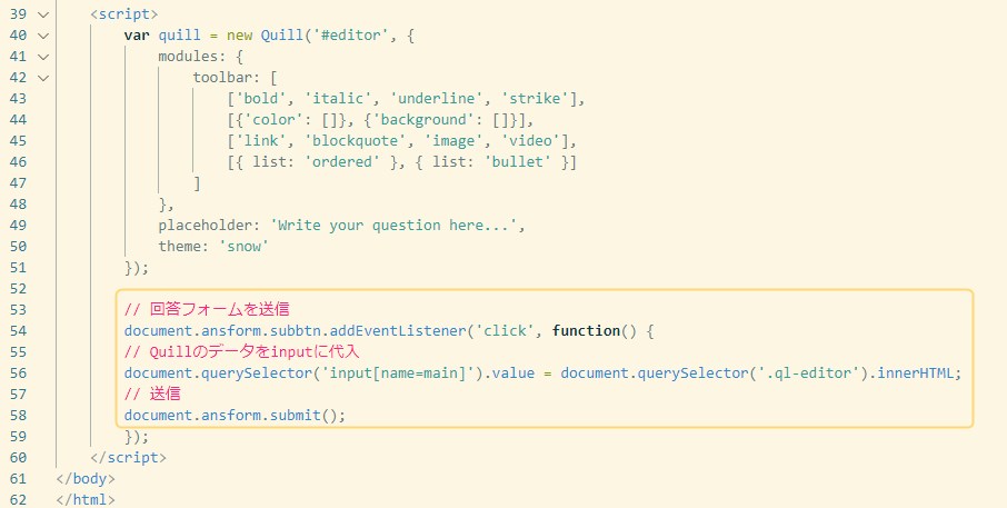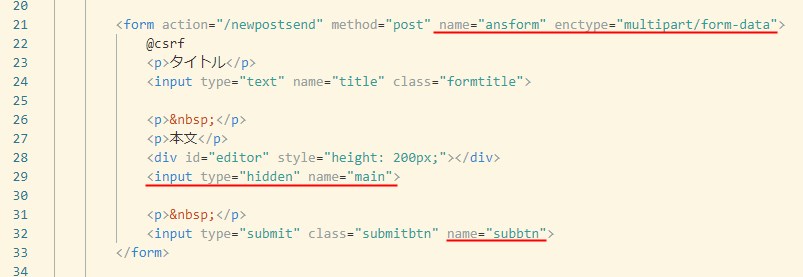 <input type=”hidden” name=”main”>は、隠しフィールドです。この隠しフィールドに、Javascriptを使って、Quillエディタに書き込まれた投稿を移し替えます。