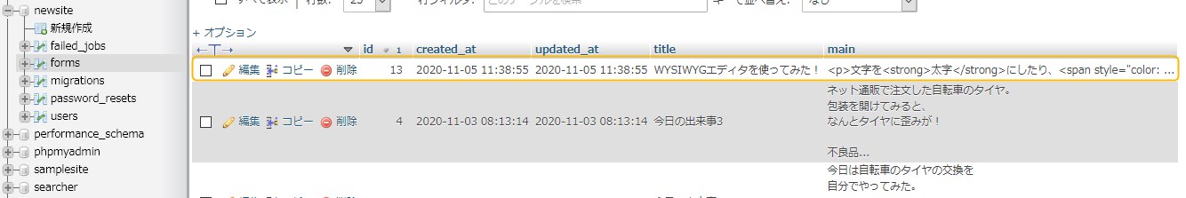 また、実際にphpMyAdminから、データがどう保存されているのかを見てみましょう。