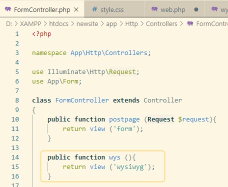 Route::get('/create2', 'FormController@wys');上書き保存してください。