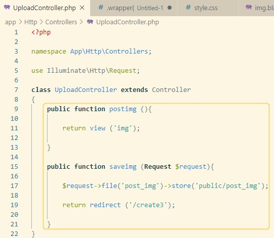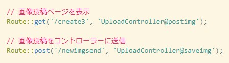 Route::post('/newimgsend', 'UploadController@saveimg');そして、上書き保存してください。