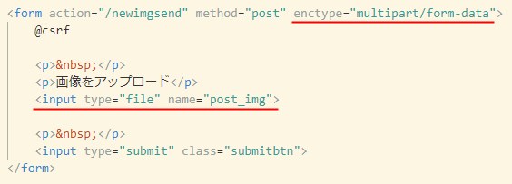 <form>の所に、enctype=”multipart/form-data”と書いてます。これは、ファイルをフォーム送信する時に必ず必要なタグです。これがないと、ファイル送信ができません。