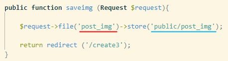 下の function saveimg は、ファイルをpublicフォルダにシンボリックリンクした、storage\post_imgフォルダに保存(store)後、元のページにリダイレクトする命令になっています。