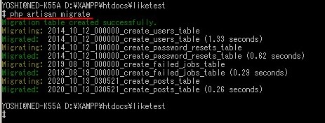 - php artisan migrate と入力、Enterしてください。
