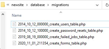 なければ、まず、database\migrationsフォルダに、以下の4つのファイルが入ってる事を確認してください。Laravelインストール時にデフォルトで付いてきます。
