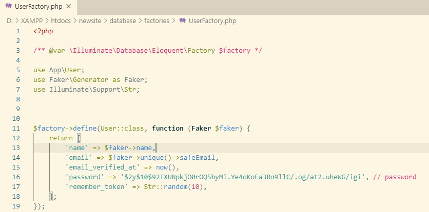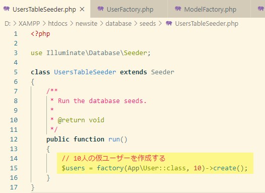 次にdatabase\factoriesフォルダの、UserFactory.phpを開いてください。
