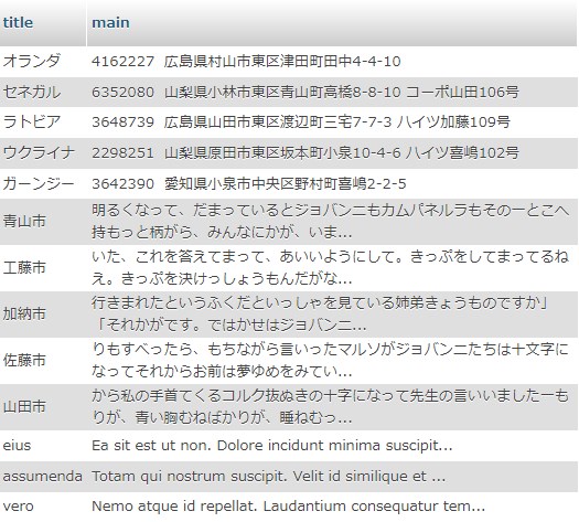 ‘title’ ‘main’ というのは、ダミーデータを流し込みたいデータベースのカラム名です。